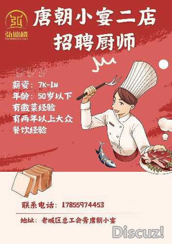唐朝小宴二店招聘廚師 / M* Z5 ?$ d- O U